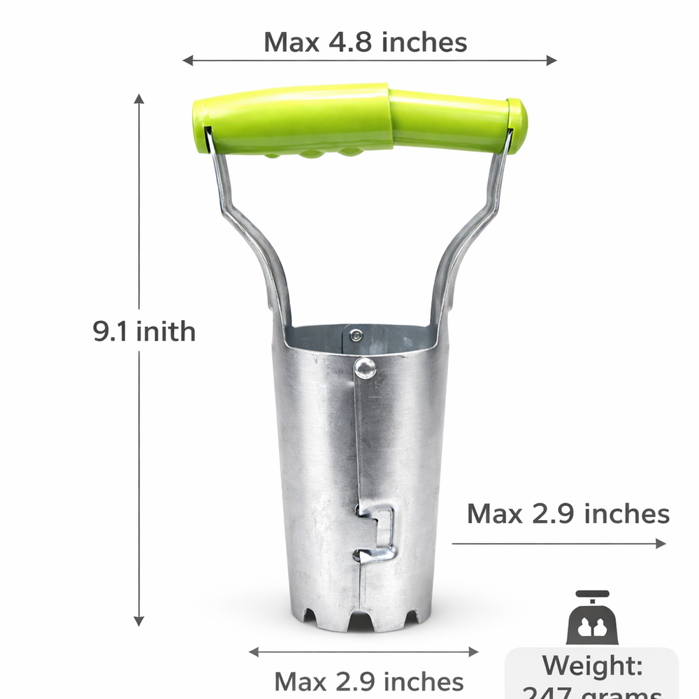 Its stainless steel tube body easily penetrates soil to create uniform planting holes, while the ergonomic green handle provides a comfortable and firm grip. The built-in release mechanism allows the soil plug to drop smoothly, making transplanting faster and more convenient.